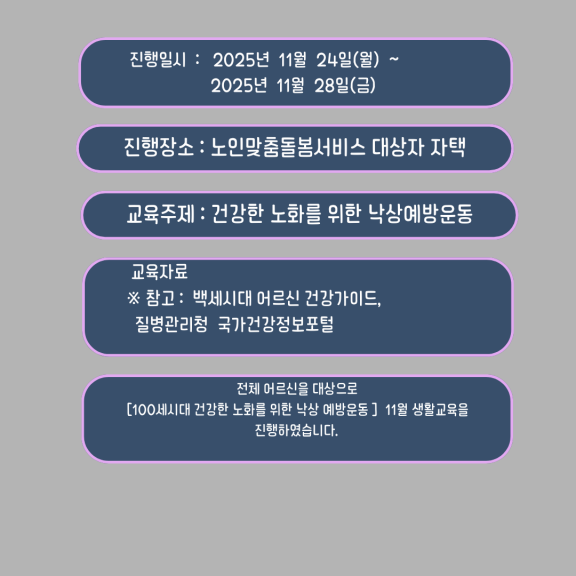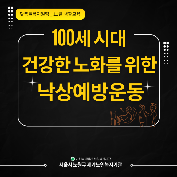 노인맞춤돌봄서비스 전체 대상자 어르신에게 [100세시대 건강한 노화를 위한 낙상예방운동]을 주제로 11월 생활교육을 실시하였습니다.