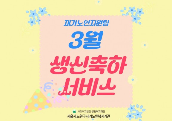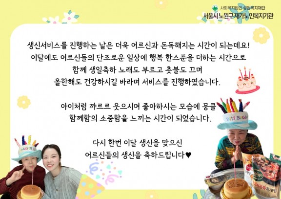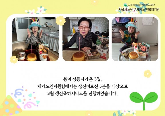 활동사진 [재가노인지원팀] 3월생신축하서비스 페이지 정보 작성자 관리자 댓글 0건 조회 11회 작성일 26-04-08 13:47 목록 본문 재가노인지원팀에서는 5명의 어르신을 대상으로 3월 생신축하서비스 진행하였습니다. ^^ 다음글2026년 3월 맞춤돌봄지원팀 생활교육 26.03.30