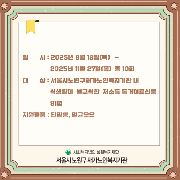 - 다음글결식독거어르신을 위한 단팥빵지원사업 달콤한 한끼, 달콤한 돌봄 달봄 서비스 25.09.19