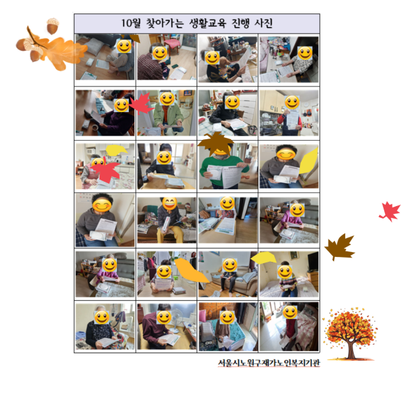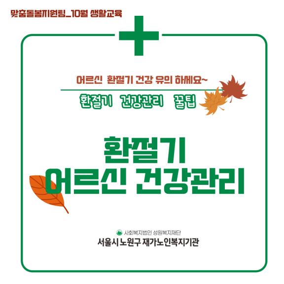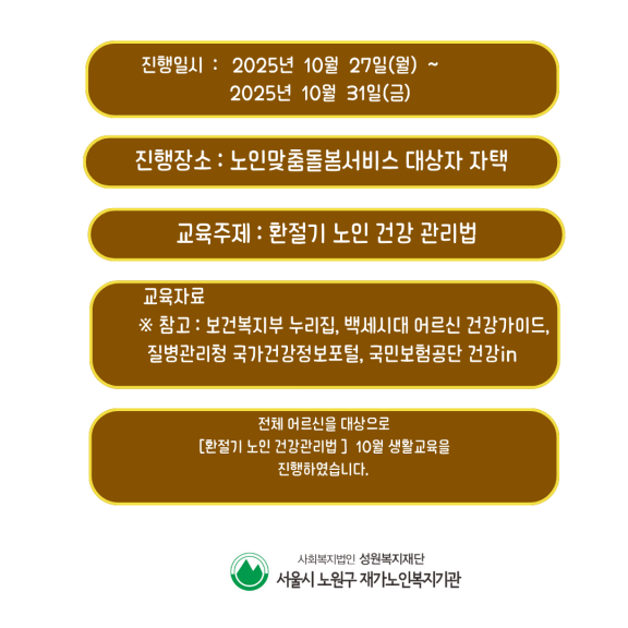 노인맞춤돌봄서비스 전체 대상자 어르신에게 [환절기 노인 건강관리법]를 주제로 10월 생활교육을 실시하였습니다.