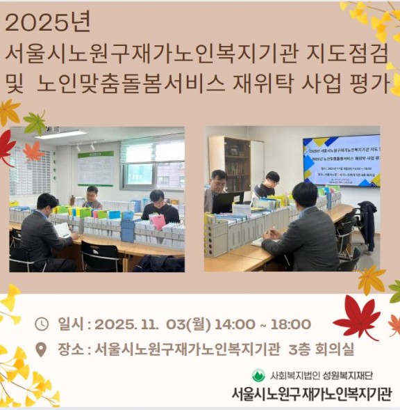내 용 : 2025년 서울시노원구재가노인복지기관 지도점검 및 노인맞춤돌봄서비스 재위탁 사업 평가 진행