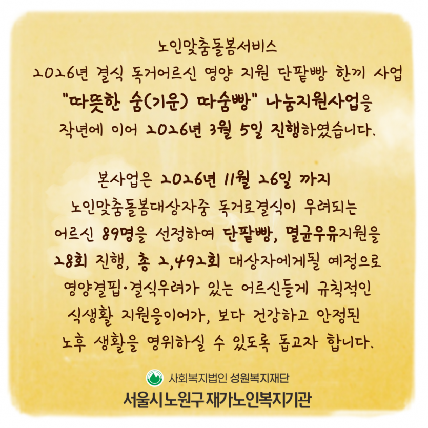 노인맞춤돌봄서비스 2026년 결식 독거어르신 영양 지원 단팥빵 한끼 사업 "따뜻한 숨(기운) 따숨빵" 나눔지…