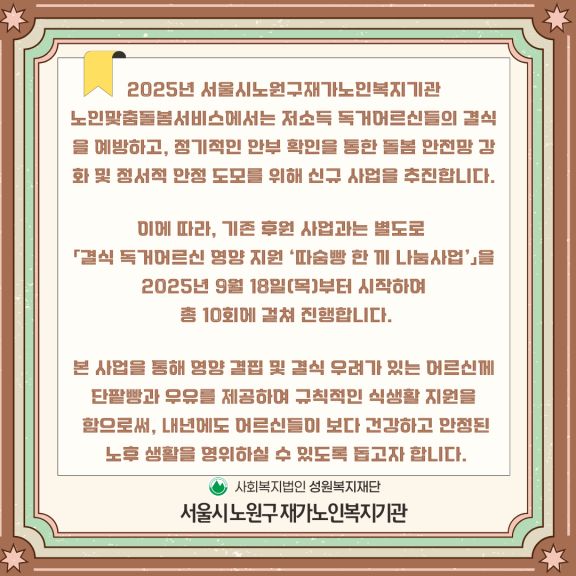 기관행사 2025년 노인맞춤돌봄서비스 결식 독거 어르신 영양지원 단팥빵 한끼 사업"따뜻한(기운) 따숨빵" 나눔지원사업…