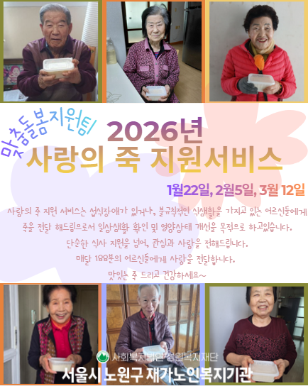 활동사진 2026년 1.2.3월 사랑의 죽 지원서비스 페이지 정보 작성자 관리자 댓글 0건 조회 14회 작성일 26-03-24 10:07 목록 본문 2026년 1.2.3월 사랑의 죽 지원서비스를 진행하였습니다. 다음글2026년 1분기 맞춤돌봄지원팀 생신축하서비스 26.03.20