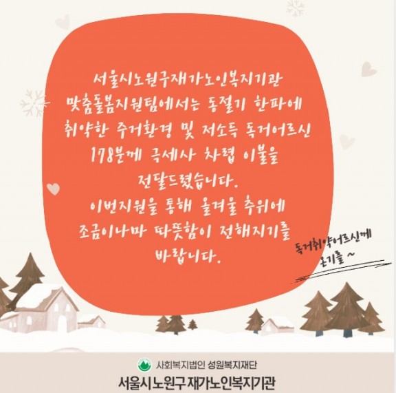 대상사 : 서울시노원구재가노인복지기관 맞춤돌봄 대상자 총 178가정 지원