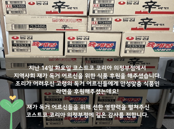 후원 자원봉사 코스트코 코리아 의정부점 식료품 전달식 페이지 정보 작성자 관리자 댓글 0건 조회 10회 작성일 25-10-15 14:34 목록 게시판 리스트 옵션 검색 본문 내용: 재가독거 어르신을 위한 식료품(30만원)상당 지원 일시: 2025년 10월 14일 화요일 다음글(주)동우개발 초아봉사단과 함께하는 2025년 주거환경개선사업 25.09.22