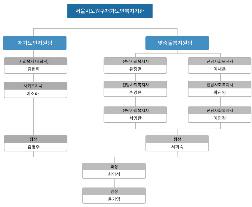 본 기관의 돌봄 조직도는 노원구어르신 「섬김 문화」를 반영하여 구성하였습니다.